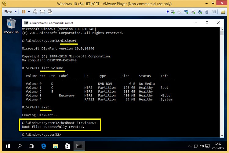List Volume должна показать, какую букву использует ваш виртуальный диск с установленной на нем Windows. Она может отличаться от того, что вы видели в системной среде. То есть, диск C может стать диском H или каким-то другим. Вам нужна именно новая буква. Затем останется только ввести команду bcdboot буква_диска:\windows, нажать Enter и, увидев сообщение об успехе, перезагрузиться и зайти в BIOS.