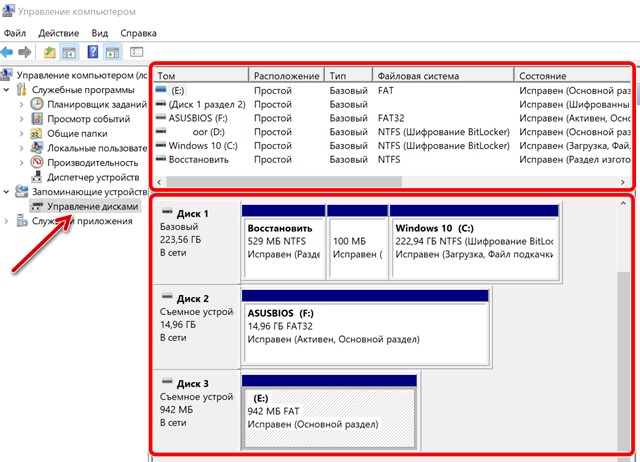 - List disk – это справочная команда, позволяющая увидеть список дисков и их номера. Запомните номер системного диска с Windows на борту. Его также можно было посмотреть в самой Windows, в разделе Управление компьютером – Запоминающие устройства – Управление дисками;