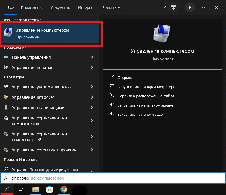 Зайдите во внутренний поиск Windows (Лупа на панели задач) и введите там “Управление компьютером”, после чего откройте это приложение;