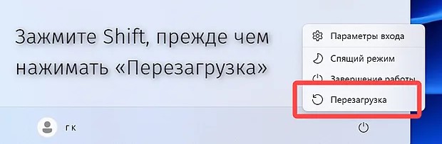 Первым делом переходим в средство восстановления Windows. Для этого нужно перейти в Пуск – Перезагрузка, но кнопку перезагрузки нажать с зажатой клавишей Shift, не отпуская ее до момента появления кружка Loading;