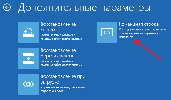 Когда компьютер перезапустится в режиме восстановления, в открывшемся меню ищем пункт “Командная строка”. Он может быть как сразу на видном месте, так и быть спрятанным в одной из подкатегорий, например, по пути “Восстановление системы – Диагностика – Дополнительные параметры – Командная строка”;
