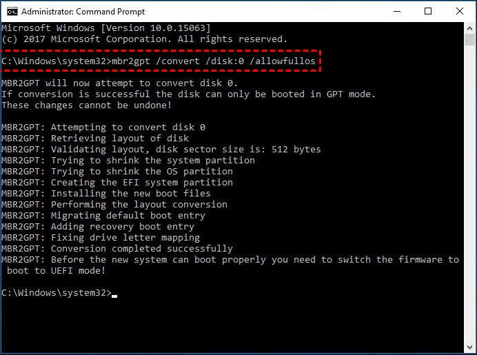 - mbr2gpt /disk:номер_диска /validate /allowFullOS – команда валидации, должна быть завершена успешно. Номер диска вводится слитно с disk:. Обязательно проверяйте корректное расположение пробелов, иначе команда не сработает;