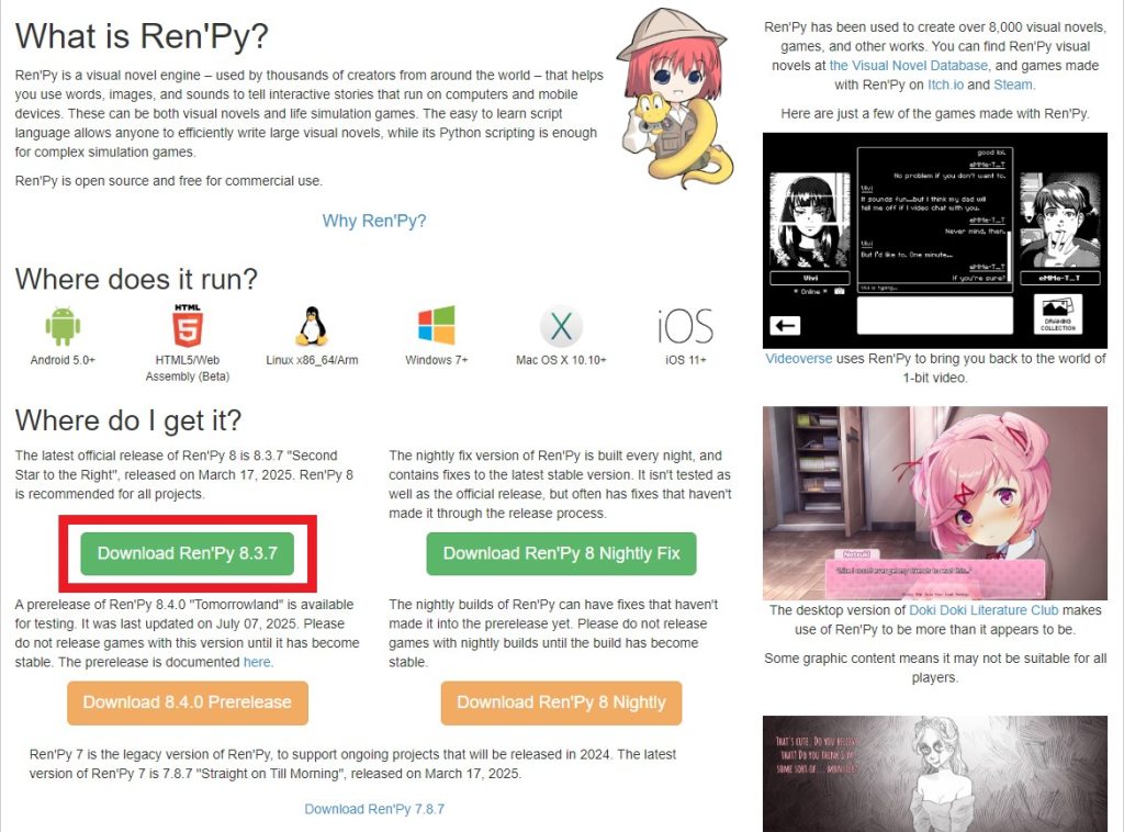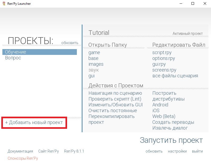Первым делом пользователю нужно установить сам Ren’py. Он абсолютно бесплатен и качается с официального сайта renpy.org (качать с других ресурсов не рекомендуется, поскольку никто тогда не гарантирует, что под видом полезного ПО вам не пропихнут какой-нибудь вирус или троян). Сам процесс установки ничем не отличается от большинства других программ – достаточно указать директорию, по желанию убрать/поставить галочку напротив пункта “Создать ярлык на рабочем столе” и нажать на старт.