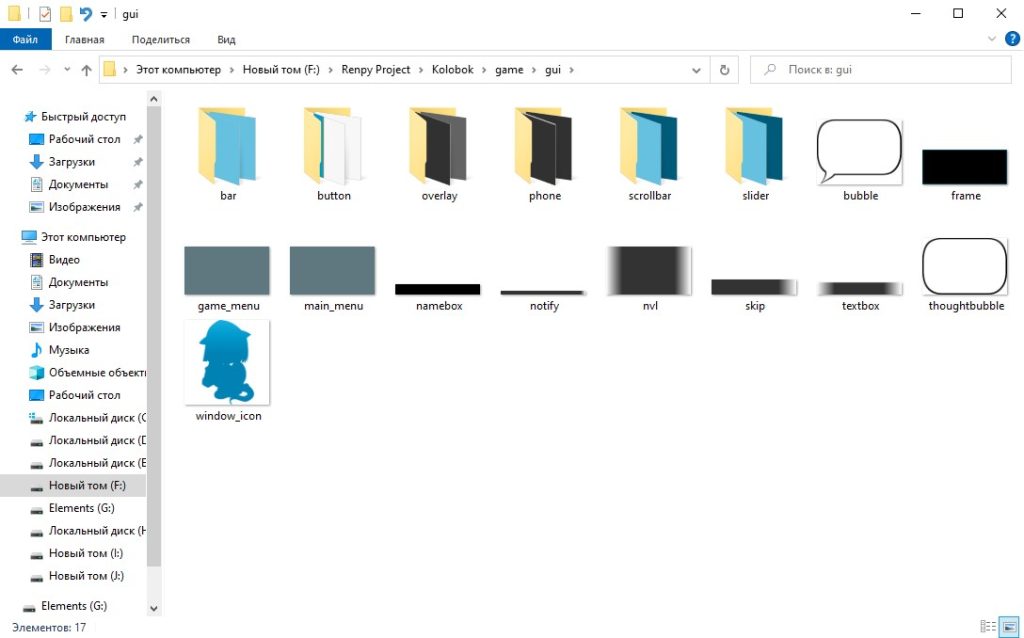 Чтобы не пришлось прописывать путь к новым файлам элементов интерфейса, начинающему разработчику новелл рекомендуется просто заменить стандартные варианты или отредактировать в любом графическом редакторе, хоть в Paint. Вот лишь малая часть того, что можно изменить: