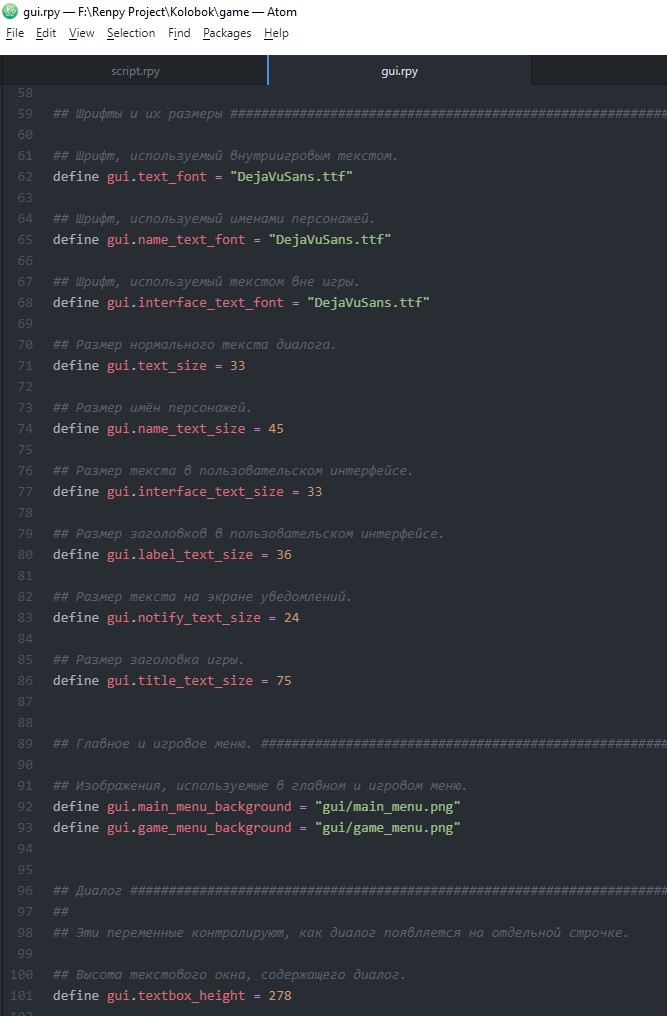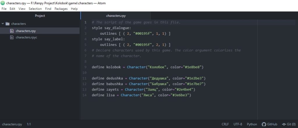 Существует несколько редакторов кода, в которых разработчик новелл на Ренпай может писать. Один из самых удобных вариантов – ATOM. Он тоже бесплатен и легко качается/устанавливается. Запустив его в первый раз, можно сразу же зайти в меню “File” и добавить папку нового проекта Ren’py (который мы уже ранее создали). Первым делом стоит создать в редакторе новый файл characters.rpy – или назвать как-то по-другому, как вам хочется, но обязательно в этом же расширении .rpy. Файл будет нужен для создания списка персонажей в примерно таком виде: