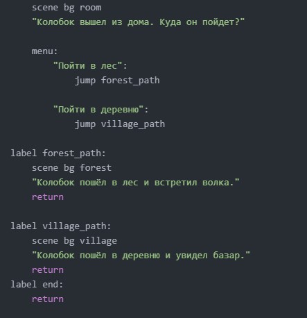 Самый простой интерактив, который можно придумать в игре – это варианты ответов/действий, определяющие дальнейший ход сюжета. В Ren’Py нелинейность создается через меню выбора (menu:). Это ключевой элемент визуальных новелл – вы показываете игроку варианты, и в зависимости от их выбора, идет другая сцена, диалог или переход к той или иной концовке. Пример кода самого простого меню представлен на скриншоте ниже.