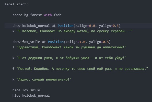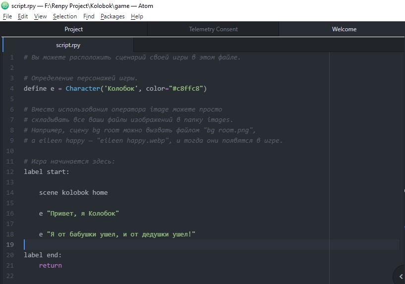 Ваши сценарные задумки по стандарту будут находиться в файле script.rpy подкаталога game. Можно сразу открыть его в ATOM и увидеть, что создатели Ren’py уже оставили будущему пользователю множество подсказок по реализации основных функций (диалоги, бэкграунд, переходы и т.д.). Прочитайте это для общего развития и смело удаляйте, оставив только первую и последнюю строчки label start: и return. Код сценария будет располагаться между ними и в самом примитивном виде выглядеть следующим образом: