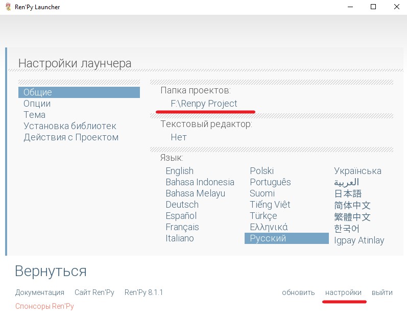 Запустив Ren’py, рекомендуется сразу указать папку, где будут храниться файлы будущего проекта. Это может быть любое удобное для вас место – главное только позаботиться о наличии свободного дискового пространства для будущих файлов. Выбирается путь по нажатию на кнопку Preferences/Настройки в правом нижнем углу.