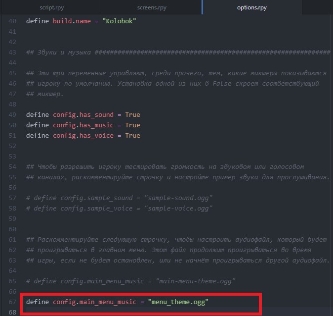 Звуковое сопровождение для визуальной новеллы не менее важно, чем хорошо написанный сюжет и сменяющие друг друга картинки. Грамотно подобранный саундтрек настраивает игрока на нужный лад и не позволяет ему заскучать во время чтения. Так что вы тоже должны добавить в свою новеллу немного музыки и хотя бы десяток разнообразных звуков. Ren’py отлично распознает форматы .mp3, .ogg, .wav и еще несколько других. Вам лишь нужно скинуть их по пути директория игры/game/audio и прописать в коде нужного элемента своего проекта (меню, сценарий и т.д.).