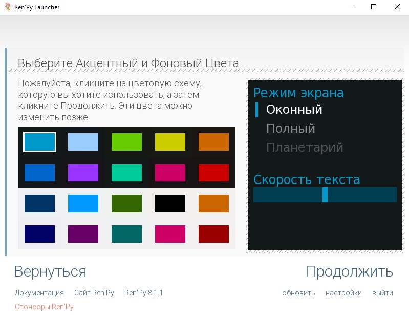 Ren’py также предлагает базовые настройки темы, главного меню и шрифтов. Неприхотливым пользователям этого будет вполне достаточно. Но, надо признать, такие меню выглядят очень дешевыми. Если надумали сделать шедевр, потом можно будет сделать кастомное меню с красивыми кнопками, переходами и дополнительными опциями. Пока же этой темы касаться не будем – есть более важные вопросы.