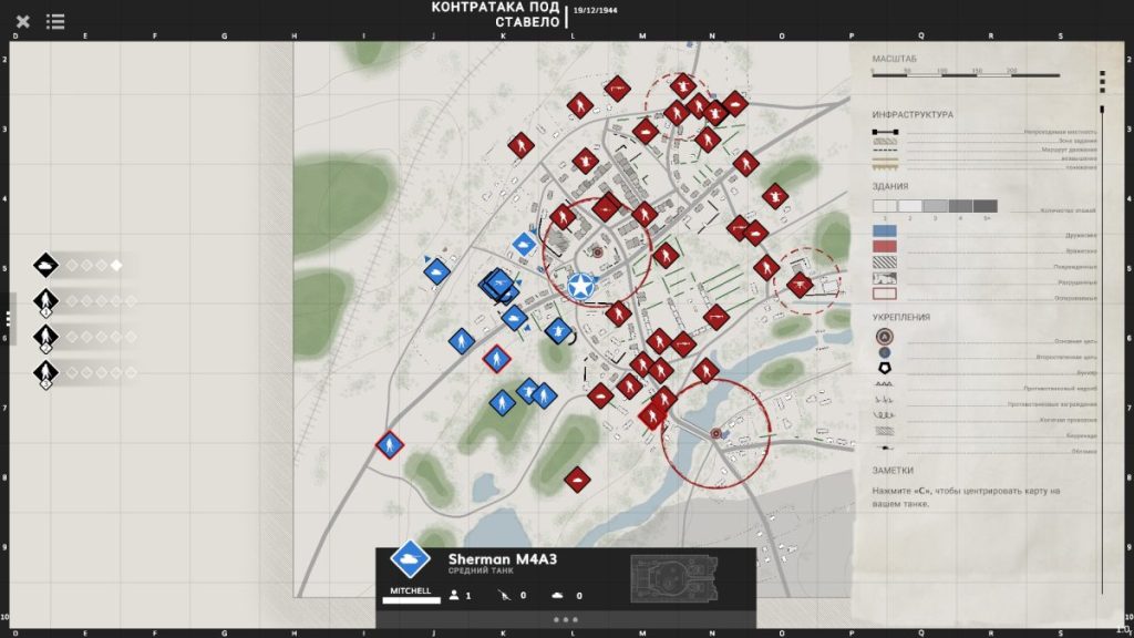 Как бы ни хотелось многим увидеть блокбастерный сюжет наподобие фильма Ярость (2014), в Sherman Commander все ограничивается историческими реалиями. Историю и лор “усатого художника” все и так знают, как и общую карту военных действий с 1939 по 1945 годы, поэтому вся предыстория умещается в один вступительный ролик. Нам вкратце обрисовывают ситуацию на западном театре военных действий, говорят о важности высадки Союзников в Европе и роли в них танковых подразделений, а затем отправляют в тур по самым известным наступательным операциям в Бастони, Арденнах и других известных локациях.