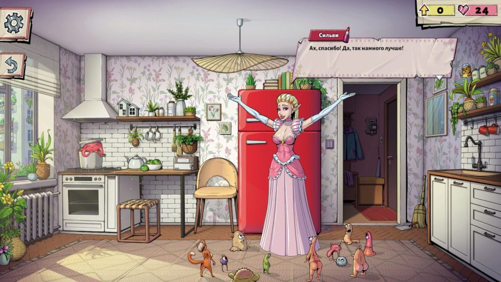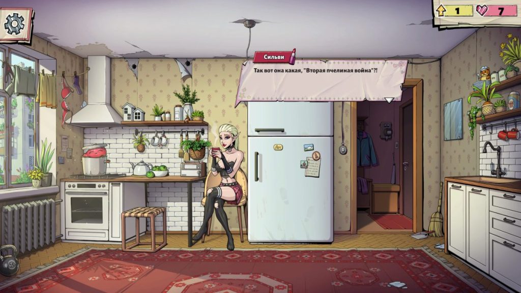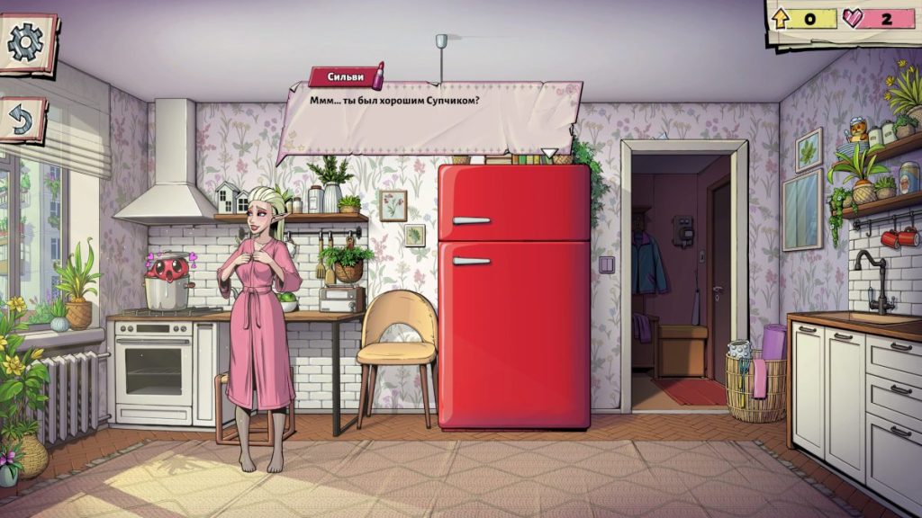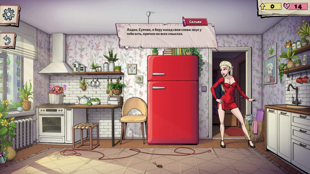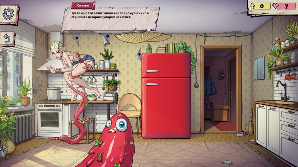 Первый, что игра обещала быть не только пошлой, но и юмористической. У нас главный герой — это кастрюля супа, которая пытается подкатить к эльфийке, что по несчастью стала обитать с орком в одной постсоветской квартире. Второе, игра от русских авторов, которые связались с нами сами. Причем, с довольно приятным арт стилем, выглядела привлекательно.
