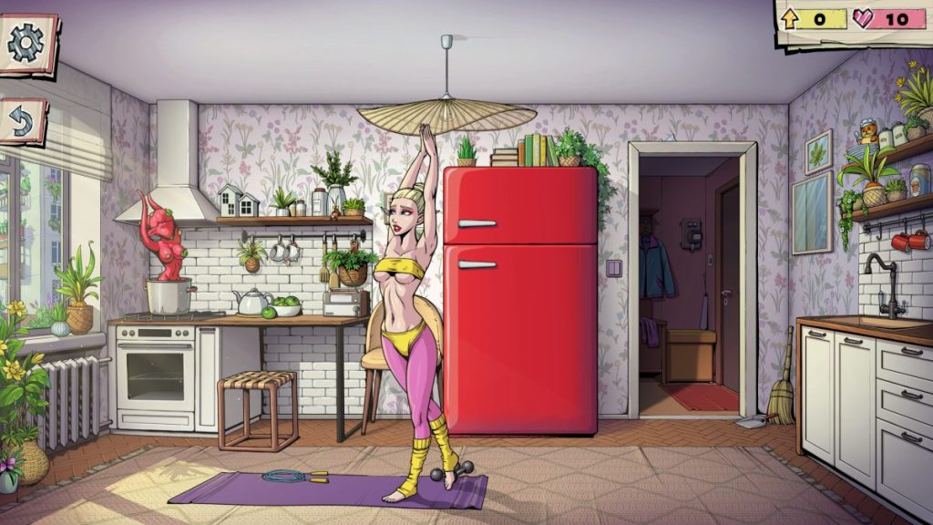 Далее локации. Точнее, локация. Кухня. Она одна, и по мере продвижения по сюжету она постепенно преображается из убитой комнаты времен разрухи девяностых во что-то более менее современное и ухоженное: старый холодильник заменяется ретро-футуристичным красным, стены покрываются обоями, новый гарнитур ит.д.. Тем не менее, это одна локация на всю игру. Да, она интересно обставлена, она — интерактивная, что встречается нечасто, но возможность кликнуть в пару банок не делает ее лично в моих глазах лучше. Вышло скудно, но старания художника видны, хвалю.